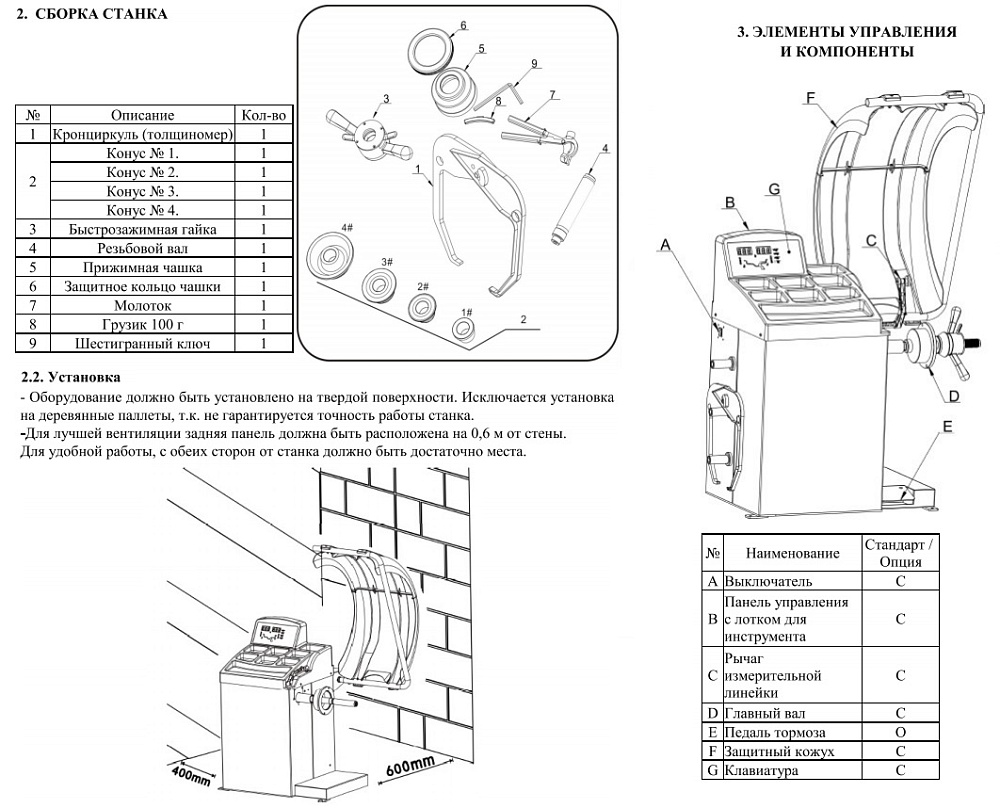 Измерение ширины колеса производится ультразвуковым сенсором Электромеханический тормоз для точной фиксации колеса в месте установки корректирующей массы Функция автоматического доворота колеса до места установки груза Точное обозначение места установки груза осуществляется лазерным указателем Возможность установки груза линейкой Установка грузов на «6 часов» (грузов на клеящейся основе) и на «12 часов» (грузов с прижимной пружиной)