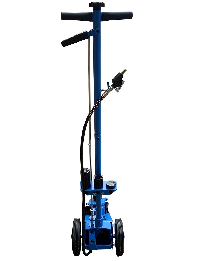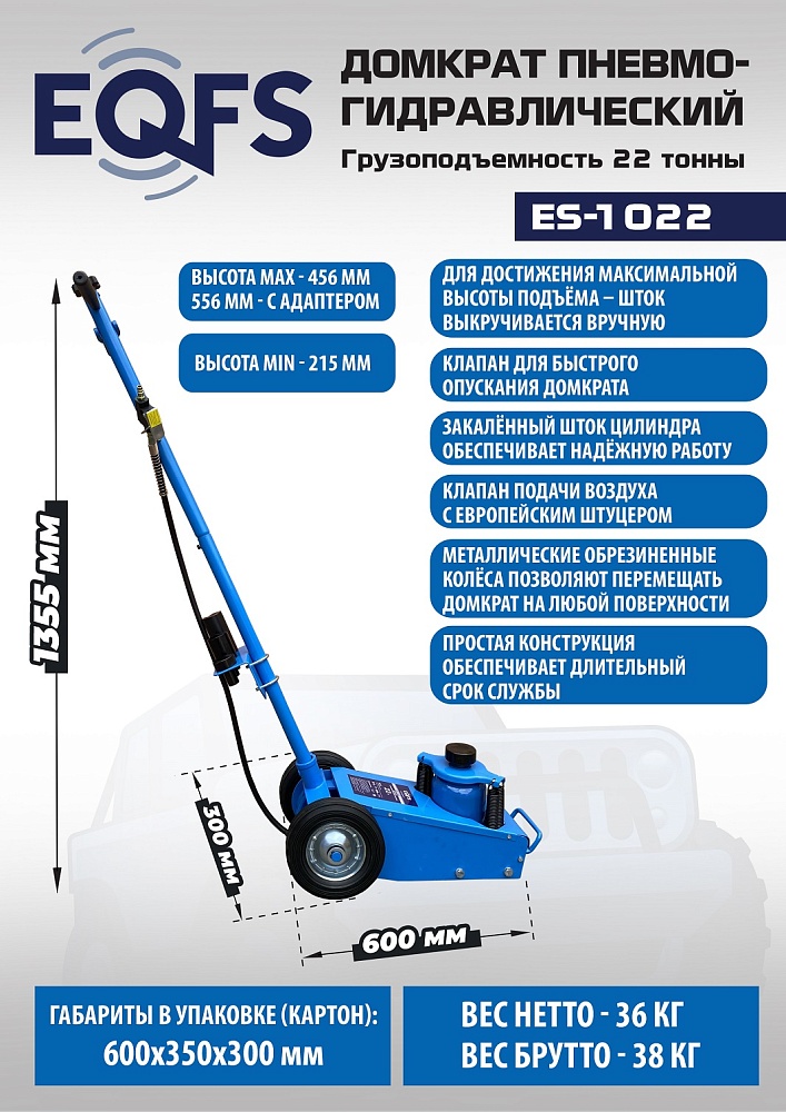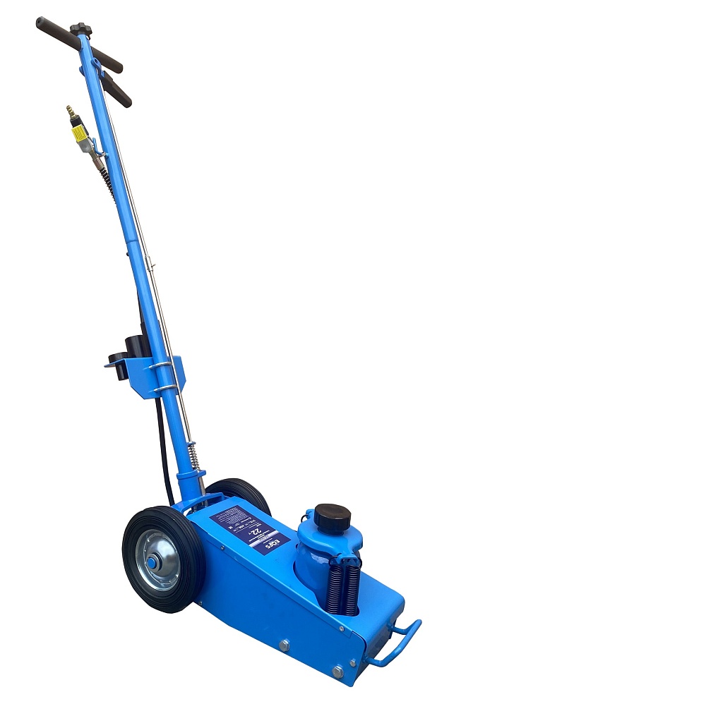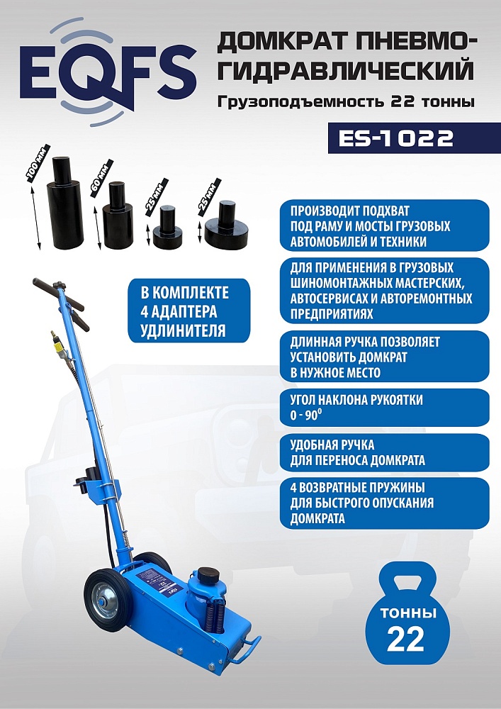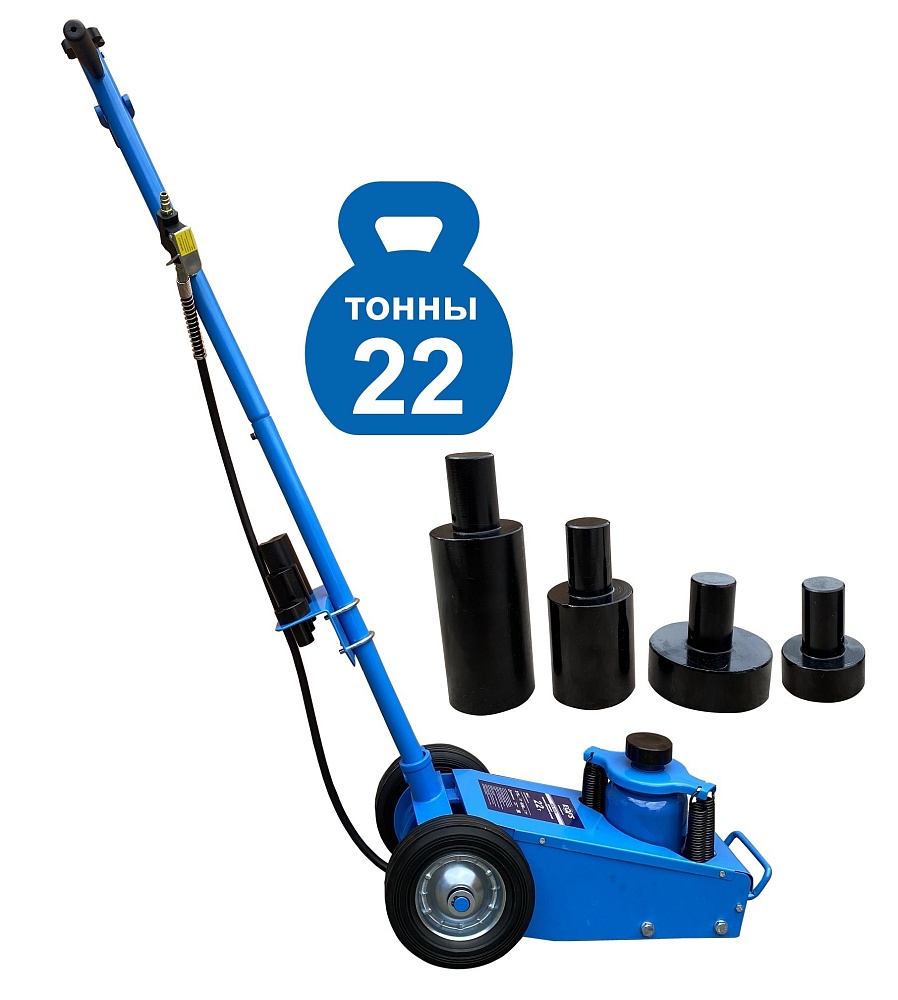 Пневмогидравлический домкрат Г/П - 22 т. Мобильный. Закаленный шток цилиндра обеспечивает надежность работы. 4 возвратные пружины для быстрого опускания домкрата. Разъем для подключения пневмосети. Клапан для быстрого опускания домкрата. Фиксатор угла наклона рукоятки. Угол наклона рукоятки 0-90грд. Удобная ручка для переноски домкрата. В комплекте 4 удлиняющих адаптера: 25 мм, 25 мм, 60 мм, 100 мм. Высота подхвата: 215-456 мм с адаптером 556 мм.<br /><br />Технические особенности ES-1022 пневмогидравлический подкатной домкрат:<ul><li>Прочная и надежная конструкция</li><li>Длинная рукоятка позволяет быстро установить домкрат в нужное место под автомобилем.</li><li>Мобильный - легко перемещается благодаря металлическим обрезиненным колесам по любой поверхности</li><li>Хромированный и закаленный шток цилиндра обеспечивает надежность работы<br /></li><li>4 возвратные пружины для быстрого опускания домкрата</li><li>Разъем для подключения пневмосети с европейским штуцером</li><li>Клапан для быстрого опускания домкрата</li><li>Угол наклона рукоятки 0-90 грд</li><li>Фиксатор угла наклона рукоятки</li><li>Удобная ручка для переноски домкрата</li><li>В комплекте 4 удлиняющих адаптера: 25 мм, 25 мм, 60 мм, 100 мм</li><li>Современный уровень безопасности</li><li>Длительный срок службы<br /></li><li>Выгодная цена</li><li>Емкость бака для заправки 1,5 л. гидравлическое масло</li></ul>