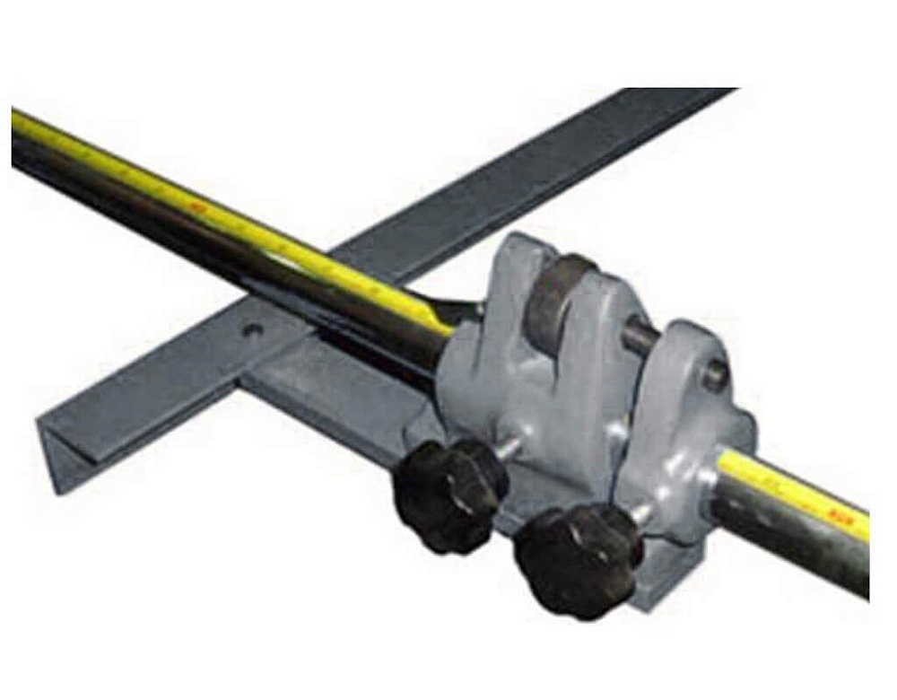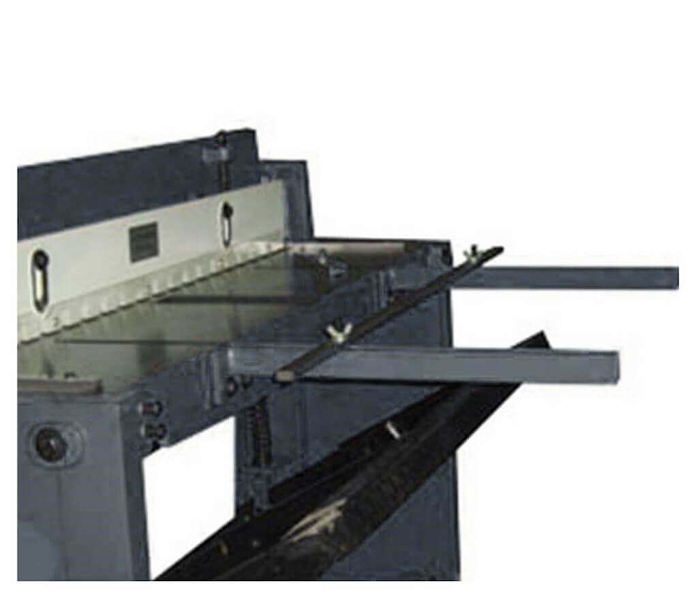 Рабочий стол снабжен боковыми упорами с двух сторон, по которым удобно выравнивать лист. На каждом упоре нанесена миллиметровая шкала, облегчающая позиционирование листа. Подвижная балка листогиба оснащена устройством защиты пальцев от повреждения. Стол гильотины имеет Т-образный паз, по которому перемещается упор для резки под углом.