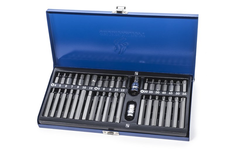 CS-BT40MM Набор бит 40 предметов (металлический кейс) биты HEX 30мм: 4, 5, 6, 7, 8, 10, 12мм биты HEX 75мм: 4, 5, 6, 7, 8, 10, 12мм биты XZN 30мм: М5, М6, М8, М10, М12 биты XZN 75мм: М5, М6, М8, М10, М12 биты TORX 30мм: Т20, Т25, Т30, Т40, Т45, Т50, Т55 биты TORX 75мм: Т20, Т25, Т30, Т40, Т45, Т50, Т55 1/2" переходник 10мм 3/8" переходник 10мм