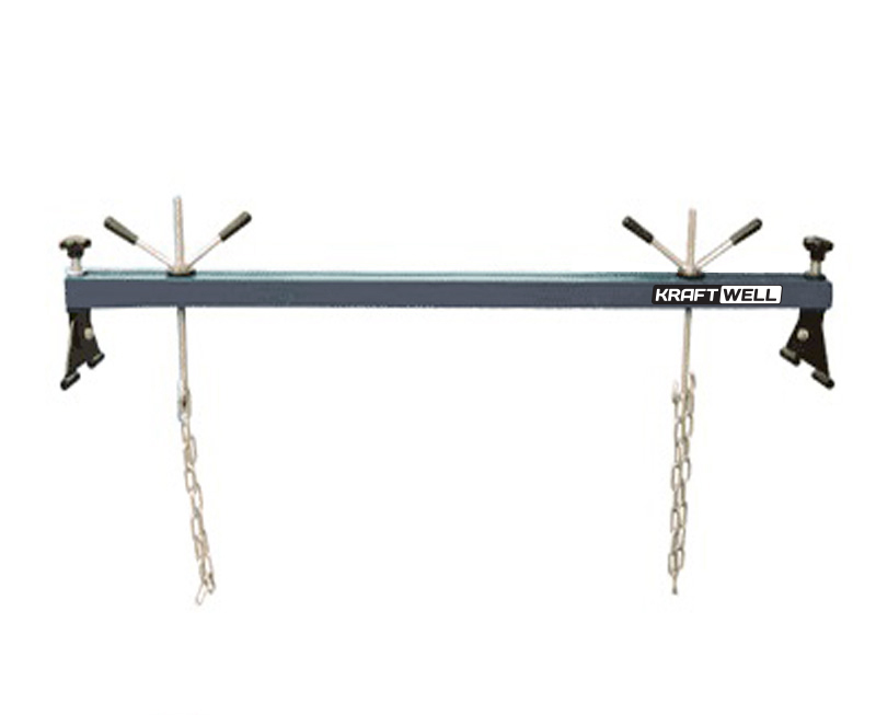 Кросс-балка для вывешивания двигателя  незаменимый инструмент при проведении ремонтных работ, где не требуется полное извлечение двигателя из моторного отсека. Например, при замене опорных подушек двигателя. Кросс-балка KRWEB2 грузоподъемностью 500 кг представляет из себя металлический профиль квадратного сечения с прорезью вдоль и опорами по бокам. Расстояние между опорами регулируется и принимает максимальное значение 1800 мм, что позволяет установить кросс-балку наиболее точно на большинство автомобилей. Резиновые накладки на опоры предохраняют автомобиль от царапин при установке балки. Отверстия в опорах дают возможность точно подобрать угол установки для оптимального распределения веса. В прорези балки установлены резьбовые шпильки с цепями на концах и удобными рукоятками, исключающими использование гаечных ключей. Высота подъема двигателя регулируется вращением рукояток. Расстояние между шпильками также регулируется, путем их перемещения вдоль прорези. Кросс-балка KRWEB2 выполнена из высококачественной стали, способной выдерживать большие нагрузки.