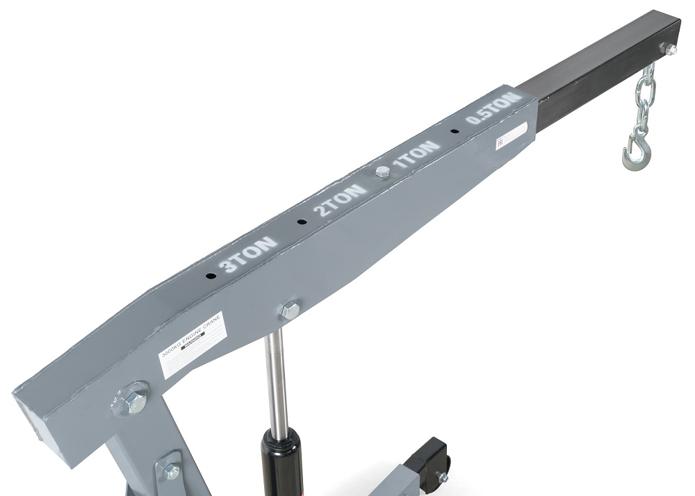 Гидравлический гаражный кран KRAFTWELL, модель KRWC10 максимальной грузоподъемностью 3000 кг имеет выдвижную стрелу, вылет которой регулируется путем ее перемещения вперед и назад с последующей фиксацией в одном из четырех положений. Предохранительный клапан, встроенный в насос, защищает от превышения максимальной нагрузки. Тем самым исключается выход из строя насоса, при попытке поднять груз весом, превышающим максимально возможный. Максимальная высота подъема при полностью выдвинутой стреле составляет 2 метра 20 сантиметров. Конструкция основания крана имеет задние поворотные колеса, что делает его маневренным. Конструкция крана нескладная.