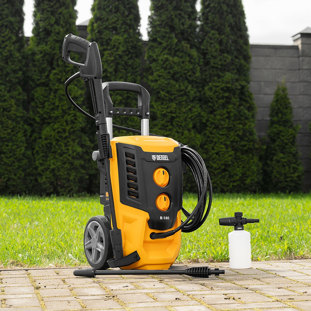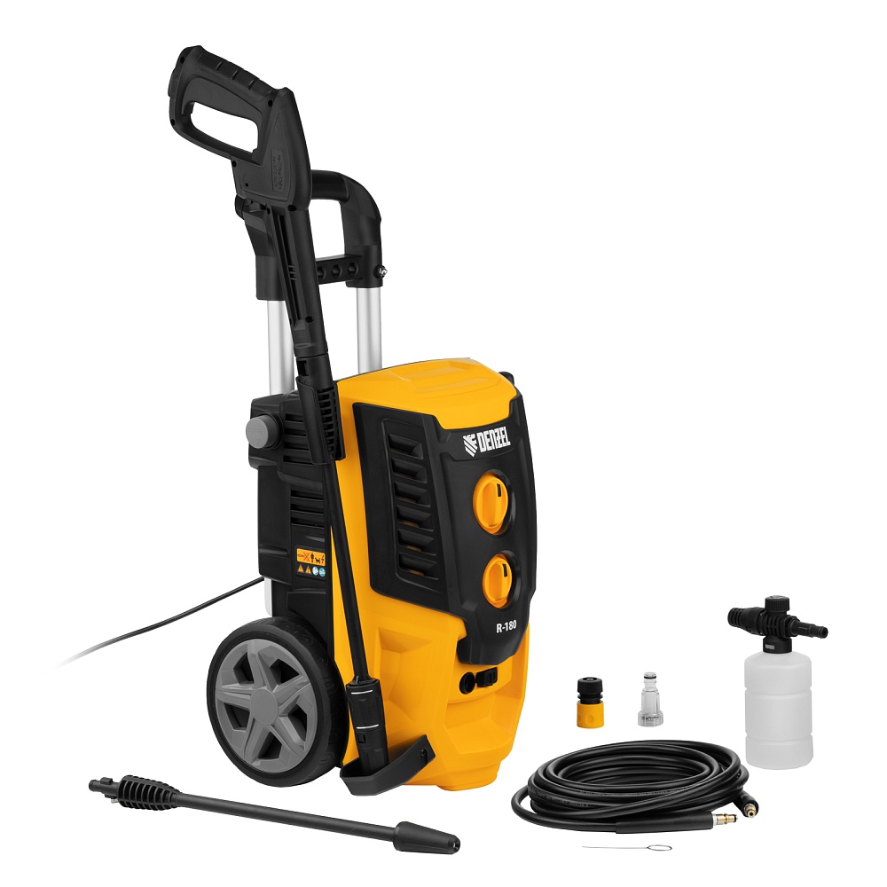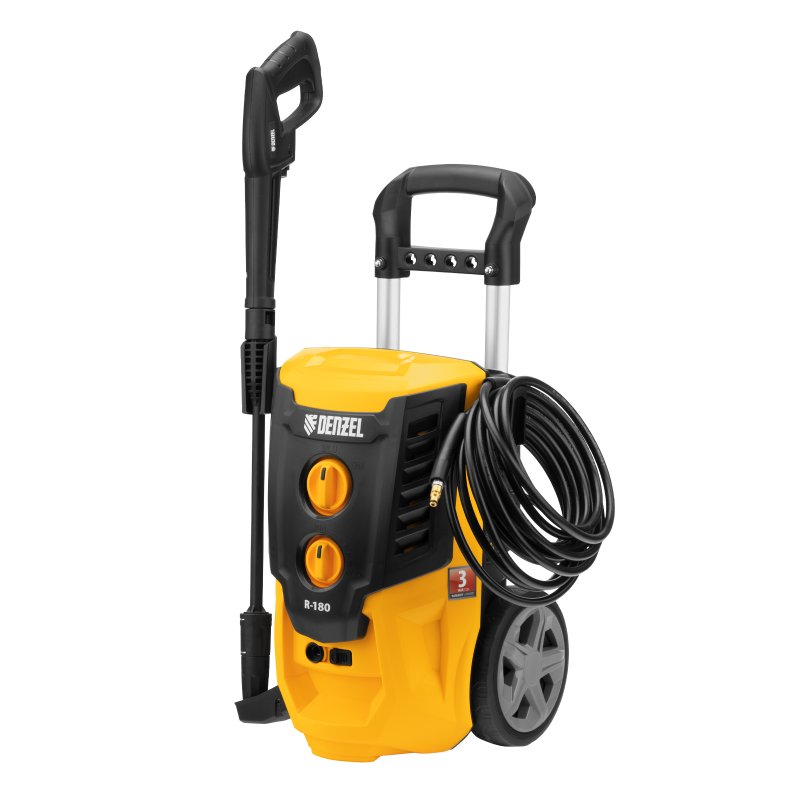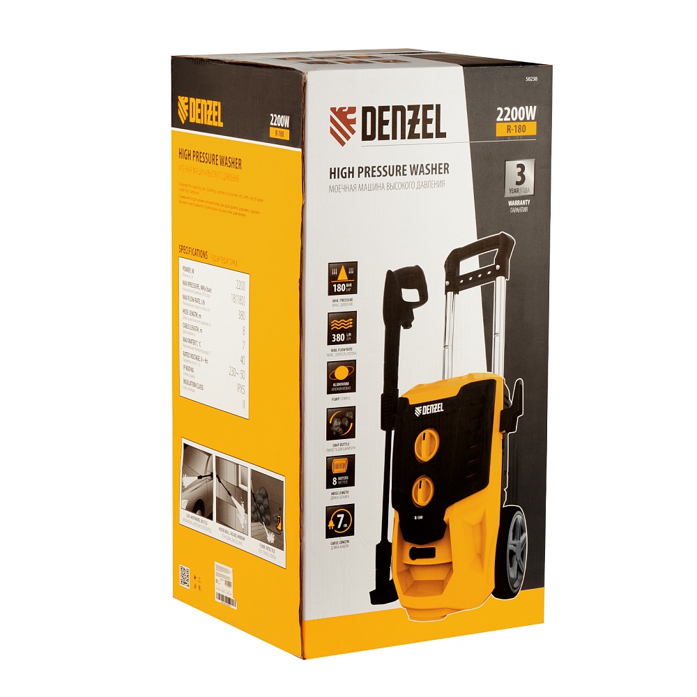 <p>Колесная моечная машина высокого давления Denzel R-180 58238 мощностью 2200 Вт и производительностью 380 л/ч подает струю воды под давлением 180 бар и служит для очищения поверхностей. Позволяет быстро привести в порядок садовые дорожки, удалить пыль и грязь с фасада здания, автомобиля, велосипеда или мотоцикла, отмыть садовый инвентарь. Моечная машина подключается к водопроводу, а при его отсутствии может забирать воду из любого резервуара, работая в режиме самовсасывания. Устройство пригодится для поддержания порядка на загородном участке.</p><h2>Преимущества</h2><ul><li>Надежность — двигатель с медной обмоткой выдерживает интенсивную эксплуатацию при высоких нагрузках.</li><li>Стабильная работа — алюминиевая помпа обеспечивает постоянное давление даже при длительном использовании.</li><li>Экологичность — мойка работает без вредных выхлопов, появление неприятных запахов исключено.</li><li>Термозащита — в случае перегрева двигатель автоматически отключается для предотвращения поломки.</li><li>Защита от случайного включения — конструкцией предусмотрена блокировка рычага пистолета.</li><li>Безопасность пользователя — токопроводящие элементы надежно изолированы, машине присвоен класс защиты II.</li><li>Чистая вода — встроенный фильтр задерживает посторонние примеси, продлевая срок службы мойки.</li><li>Использование моющего средства — машина имеет встроенный бачок, также можно подключить внешний пеногенератор, входящий в комплект поставки.</li><li>Регулировка количества пены встроенного пенокомплекта — можно подобрать оптимальный режим в зависимости от степени загрязнения поверхности.</li><li>Максимальная эффективность — моечная машина комплектуется грязевой фрезой, позволяющей быстро справиться даже с застарелыми загрязнениями.</li><li>Легкая подготовка к работе — благодаря быстросъемному адаптеру входной шланг подключается одним движением.</li><li>Увеличенная рабочая зона — шланг длиной 8 м и 7-метровый кабель позволяют свободно перемещаться по участку.</li><li>Простой уход — игла для прочистки сопла входит в комплект поставки.</li><li>Комфортная транспортировка — машина оснащена колесами и ручкой для удобного перемещения.</li><li>Удобное хранение — конструкцией предусмотрены держатель пистолета и кронштейн для сетевого кабеля.</li><li>Гарантия 3 года — высокое качество моечной машины подтверждено производителем.</li></ul>