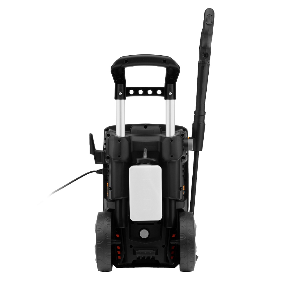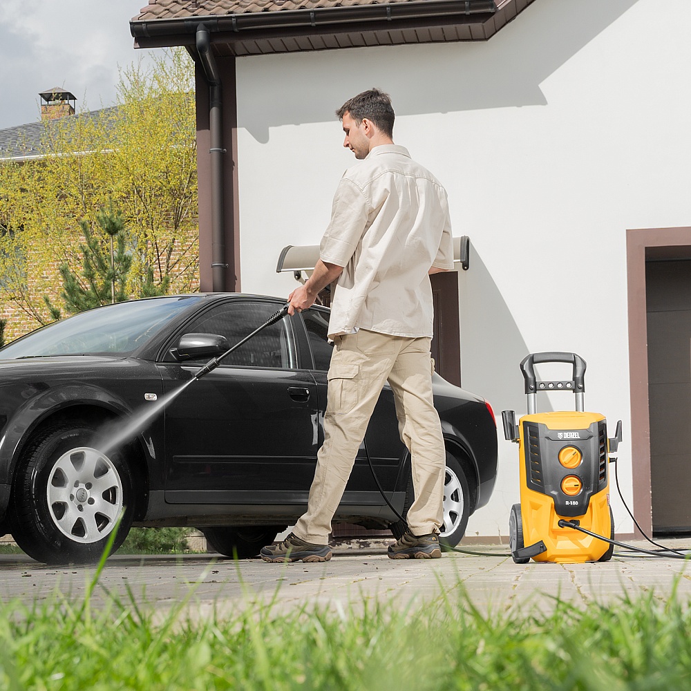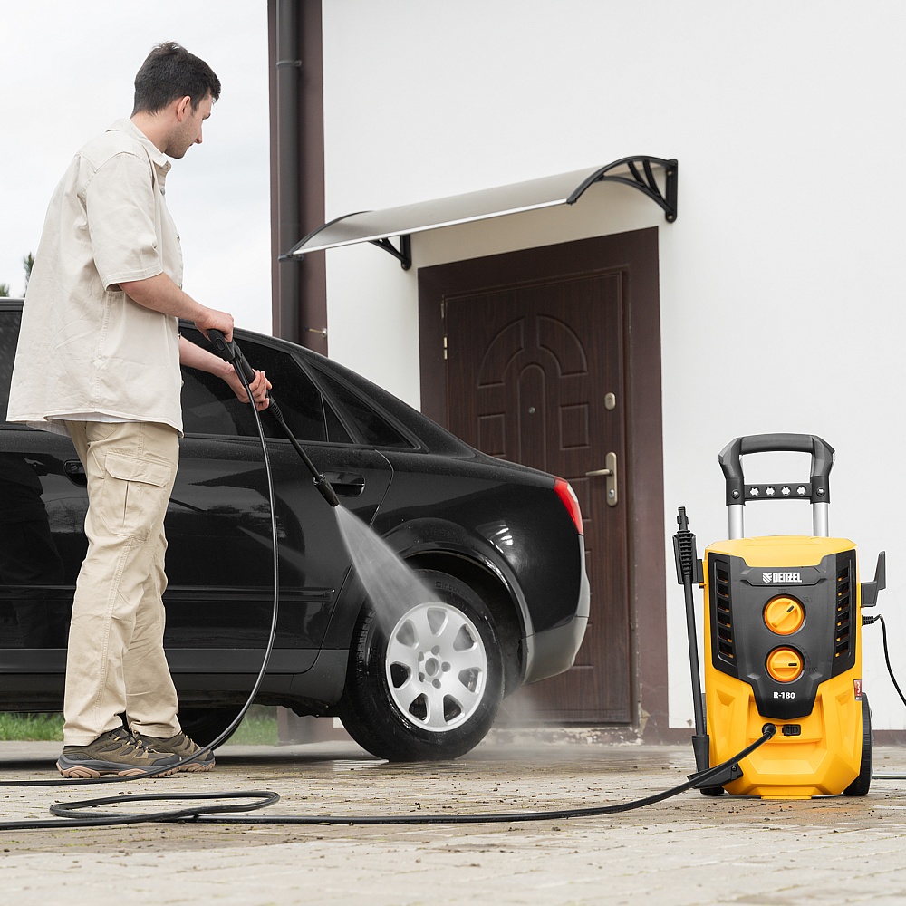 <p>Колесная моечная машина высокого давления Denzel R-180 58238 мощностью 2200 Вт и производительностью 380 л/ч подает струю воды под давлением 180 бар и служит для очищения поверхностей. Позволяет быстро привести в порядок садовые дорожки, удалить пыль и грязь с фасада здания, автомобиля, велосипеда или мотоцикла, отмыть садовый инвентарь. Моечная машина подключается к водопроводу, а при его отсутствии может забирать воду из любого резервуара, работая в режиме самовсасывания. Устройство пригодится для поддержания порядка на загородном участке.</p><h2>Преимущества</h2><ul><li>Надежность — двигатель с медной обмоткой выдерживает интенсивную эксплуатацию при высоких нагрузках.</li><li>Стабильная работа — алюминиевая помпа обеспечивает постоянное давление даже при длительном использовании.</li><li>Экологичность — мойка работает без вредных выхлопов, появление неприятных запахов исключено.</li><li>Термозащита — в случае перегрева двигатель автоматически отключается для предотвращения поломки.</li><li>Защита от случайного включения — конструкцией предусмотрена блокировка рычага пистолета.</li><li>Безопасность пользователя — токопроводящие элементы надежно изолированы, машине присвоен класс защиты II.</li><li>Чистая вода — встроенный фильтр задерживает посторонние примеси, продлевая срок службы мойки.</li><li>Использование моющего средства — машина имеет встроенный бачок, также можно подключить внешний пеногенератор, входящий в комплект поставки.</li><li>Регулировка количества пены встроенного пенокомплекта — можно подобрать оптимальный режим в зависимости от степени загрязнения поверхности.</li><li>Максимальная эффективность — моечная машина комплектуется грязевой фрезой, позволяющей быстро справиться даже с застарелыми загрязнениями.</li><li>Легкая подготовка к работе — благодаря быстросъемному адаптеру входной шланг подключается одним движением.</li><li>Увеличенная рабочая зона — шланг длиной 8 м и 7-метровый кабель позволяют свободно перемещаться по участку.</li><li>Простой уход — игла для прочистки сопла входит в комплект поставки.</li><li>Комфортная транспортировка — машина оснащена колесами и ручкой для удобного перемещения.</li><li>Удобное хранение — конструкцией предусмотрены держатель пистолета и кронштейн для сетевого кабеля.</li><li>Гарантия 3 года — высокое качество моечной машины подтверждено производителем.</li></ul>