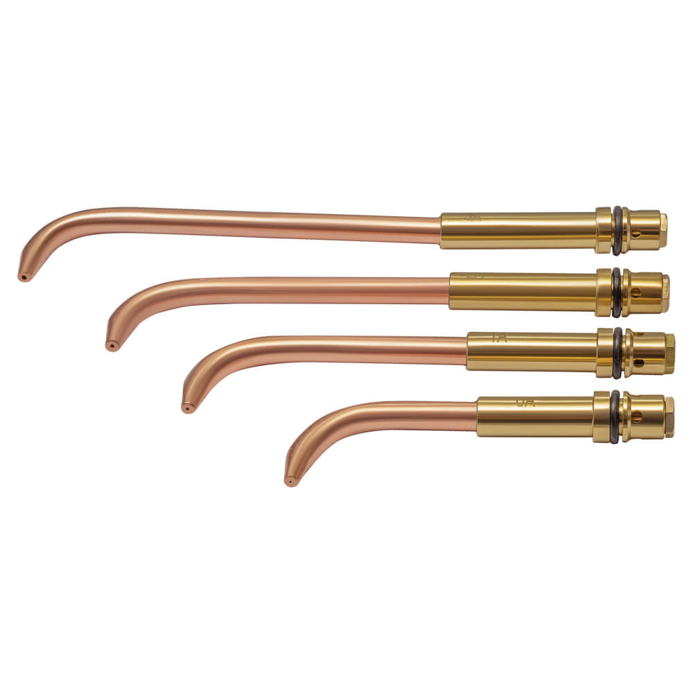 Медный цельнотянутый наконечник №0А для сварочной ацетиленовой горелки Г2А-4М-02. Предназначен для газопламенной обработки металлов толщиной 0,2–0,5 мм. Угол изгиба носика наконечника – 90°.