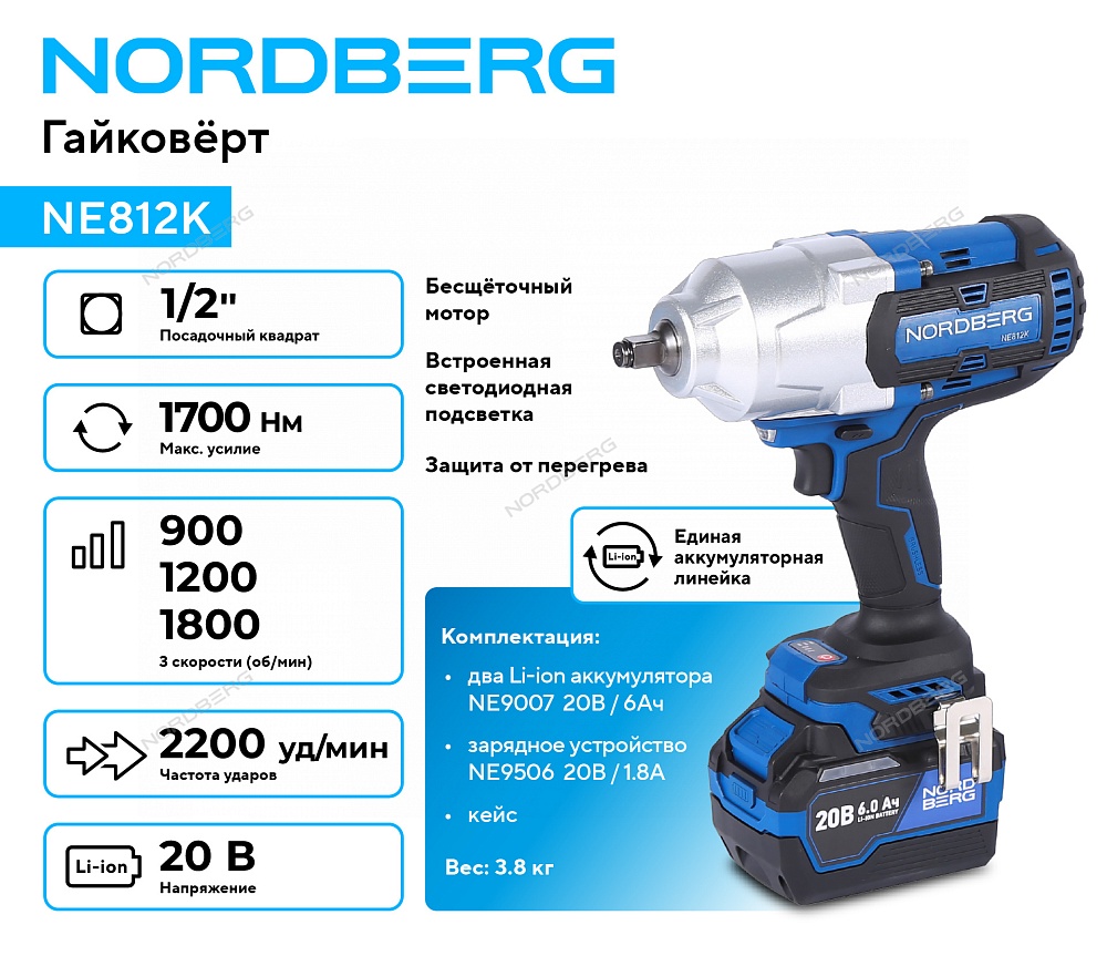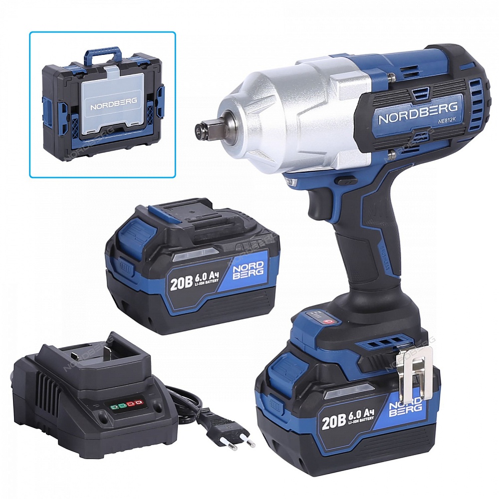 Гайковерт аккумуляторный, 1/2", 21 В, 1700 Нм, 2 аккумулятора 6A и зарядное устройство, в кейсе NORDBERG NE812K купить в Саратове цена ✅ - Все для СТО