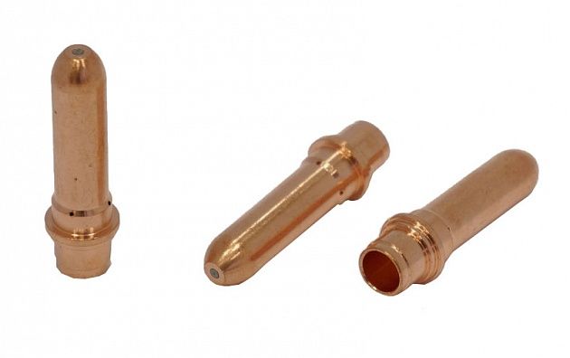 Катод - расходная часть плазмотрона. Оснастку изготавливают из сплава меди и латуни. Данный сплав обладает отличными показателями токопроводимости, высокими прочностными характеристиками, а так же способствует лучшему теплоотводу. Чаще всего для работы в нейтральных плазмообразующих средах в качестве сердечника электрода используют вольфрам, в окислительных средах применяют катоды из циркония или гафния.