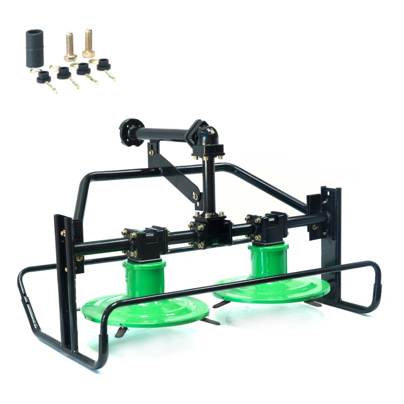 Роторная косилка предназначена для работ по заготовке сена и соломы. Устройство подходит для использования в полях с различными типами густой и высокой травы, для зерновых культур и даже кустарника (с толщиной стебля не более 10 мм).  Диски косилки вращаются навстречу друг другу, 8 ножей, находящихся по сторонам дисков, под действием центробежной силы выходят за края кожуха и срезают траву. С помощью механизмов настройки, оператор сможет увеличить или уменьшить высоту стерни.