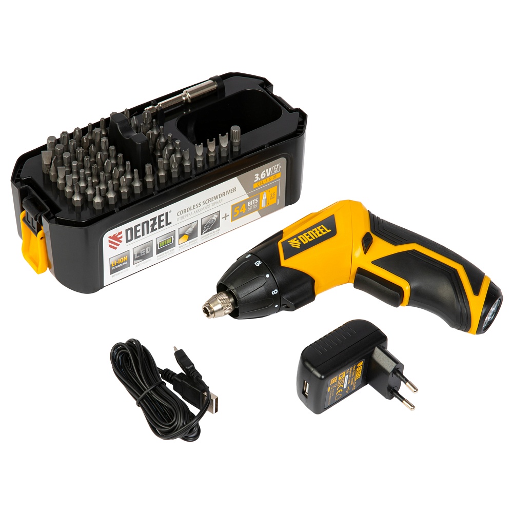 <p>Аккумуляторная отвертка Denzel CSL-3,6-01 26001 с аккумулятором Li-Ion на 3,6 В и 1,3 Ач, в комплекте с аксессуарами, используется для работы с саморезами, шурупами и винтами. Быстро справляется с закручиванием крепежа благодаря максимальному крутящему моменту 4 Нм и частоте вращения 200 об/мин. Встроенный литий-ионный аккумулятор быстро заряжается, характеризуется низким саморазрядом, и отсутствием эффекта памяти, что обеспечивает эффективную работу.</p><h2>Преимущества</h2><ul><li>10 ступеней регулировки — можно установить оптимальную величину крутящего момента в зависимости от типа крепежа.</li><li>Устойчивость к механическим повреждениям — корпус изготовлен из ударопрочного пластика.</li><li>Долговечность — медная обмотка двигателя обеспечивает длительную стабильную работу.</li><li>Термозащита — в случае перегрева двигатель останавливается, что предотвращает его поломку.</li><li>Автоматическая блокировка шпинделя — можно вручную затянуть или открутить крепеж при необходимости.</li><li>Работа без непредвиденных перерывов — встроенный LED-индикатор заряда батареи позволяет своевременно произвести подзарядку.</li><li>Светодиодная подсветка — рабочая зона будет хорошо видна в любое время дня.</li><li>Надежная фиксация оснастки — благодаря механическому держателю бита не выпадает во время работы.</li><li>Удобная зарядка — отвертка совместима со стандартным кабелем USB-microUSB.</li><li>Эргономичность — поворотная обрезиненная рукоятка фиксируется в нужном положении и позволяет работать в труднодоступных местах.</li><li>Продуманная комплектация — к инструменту прилагается набор из 54 бит, что позволяет сразу приступить к работе.</li><li>Небольшой вес 0,42 кг — можно долго работать без ощущения усталости.</li><li>Удобное хранение и транспортировка — отвертка с аксессуарами поставляется в пластиковом кейсе с прозрачной крышкой.</li><li>Гарантия 3 года — высокое качество отвертки подтверждено производителем.</li></ul>