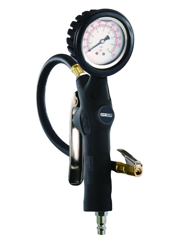 KRWTG-A2 KraftWell Пистолет для подкачки шин. В цветной коробке. Аналоговый жидкостный манометр. Пластиковая рукоятка, пластиковый курок. Давление до 16 бар.