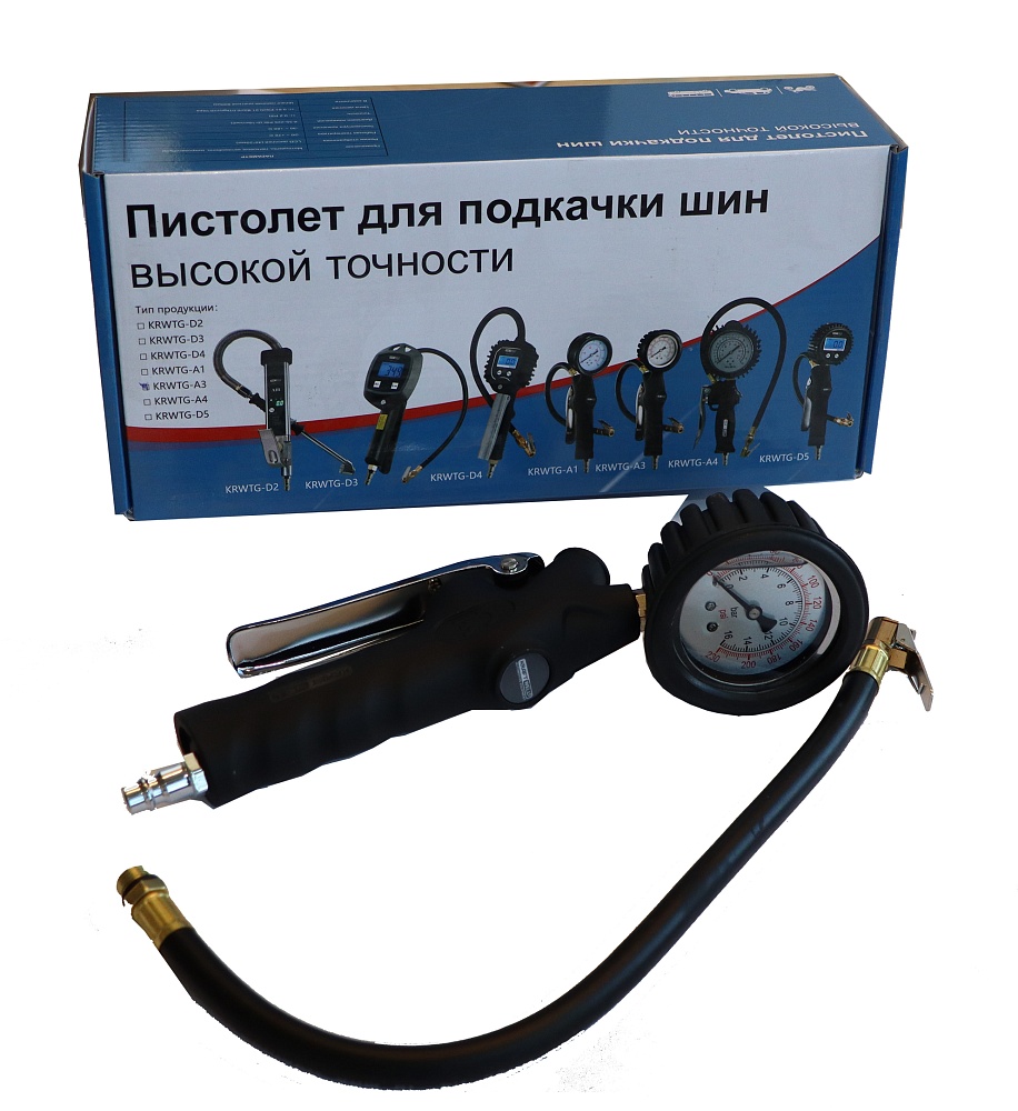 KRWTG-A3 KraftWell Пистолет для подкачки шин. В цветной коробке. Аналоговый жидкостный манометр. Пластиковая рукоятка, металлический курок. Давление до 16 бар.