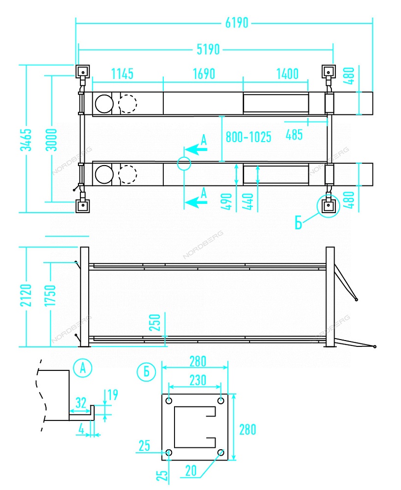 Подъемник четырехстоечный 5 т, без траверсы, для сход-развала, механическое снятие, синий NORDBERG 4450_MB купить в Саратове цена ✅ - Все для СТО