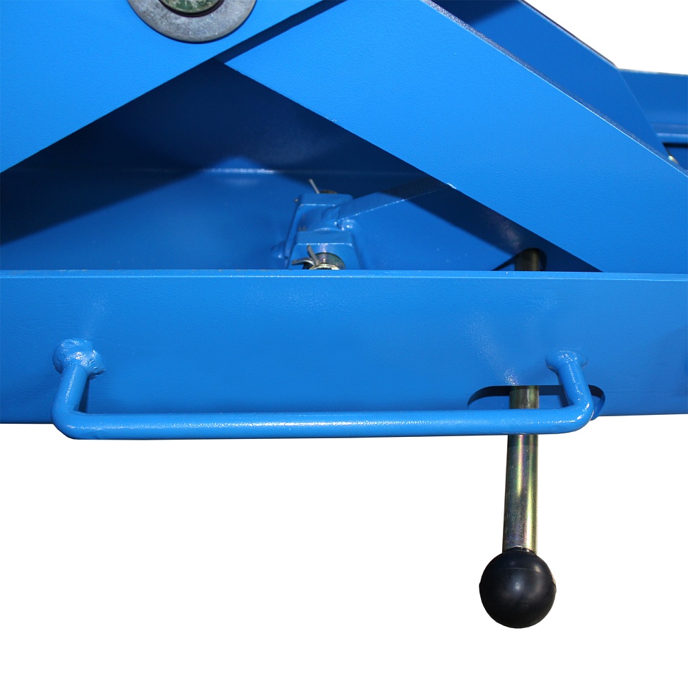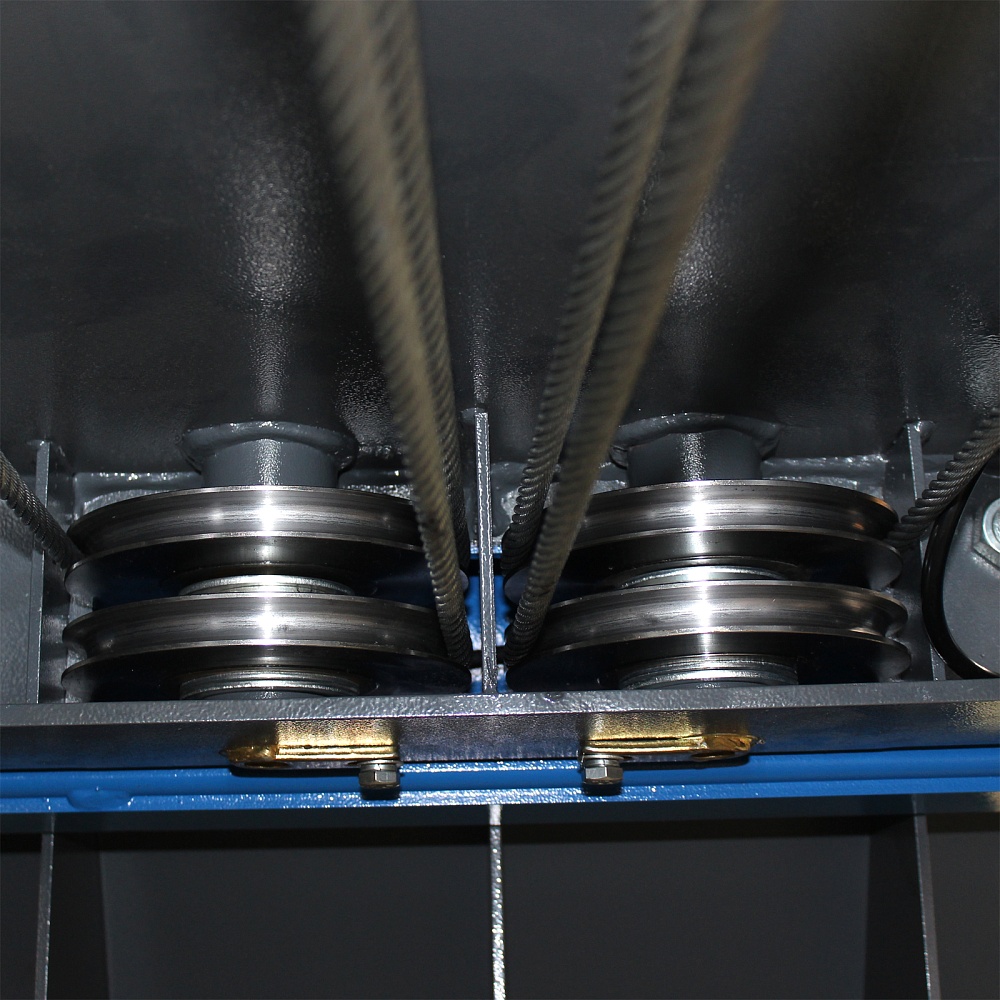 Оборудование приводится в действие гидравлическими цилиндрами и системой стальных тросов, что дает невысокий уровень шума. Данная модификация включает набор скользящих пластин и поворотных дисков, а также траверсу для реализации работ по развалу-схождению колес.