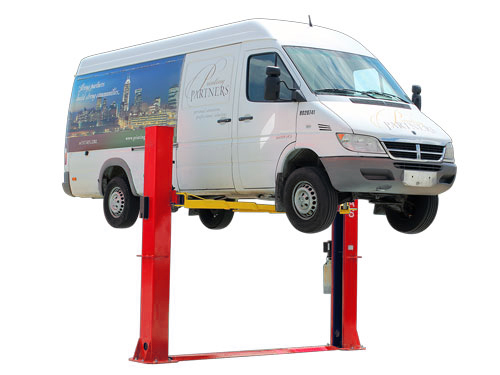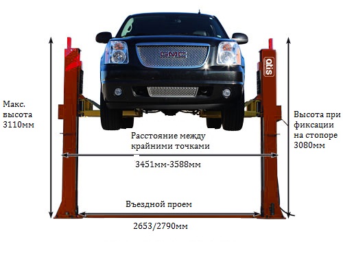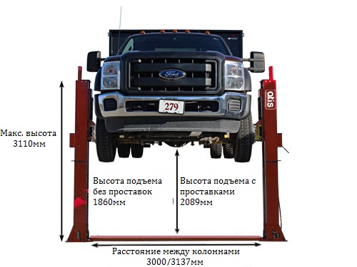 Двухстоечный электрогидравлический подъемник с верхней синхронизацией, грузоподъемность 6.8 т, высота колонны 4753/5058мм, механическое управление стопорами на одной колонне.