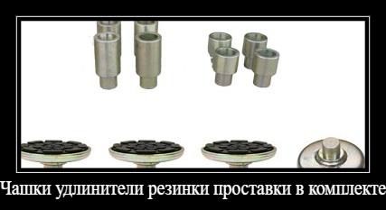 Подъемник комплектуется телескопическими удлинителями разной высоты и телескопическими чашками с резиновыми накладками. Размеры удлинителей - 38 мм, 63 мм, d - 38 мм