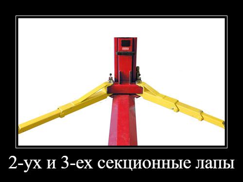 Подъемник оснащен 3-ех секционными передними лапами и 2-ух секционными задними, что позволяет с легкостью обслуживать как короткобазные автомобили, так и длиннобазные.