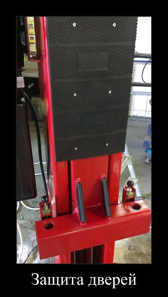 На внутренней части каждой стойки установлены резиновые пластины в местах, где двери автомобиля могут контактировать с металлической конструкцией подъемника, позволяет обеспечить надежную защиту дверей автомобиля, установленного на двухстоечном подъемнике, от возможного повреждения при их открывании.