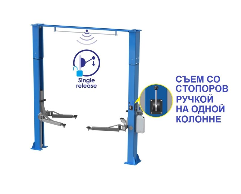 Двухстоечный электрогидравлический подъемник с верхней синхронизацией, грузоподъемность 6.8 т, высота колонны 4753/5058мм, механическое управление стопорами на одной колонне.