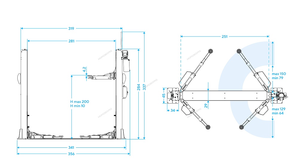 Подъемник 2х стоечный г/п 4,5т, 380В (серый) NORDBERG N4125-4,5G