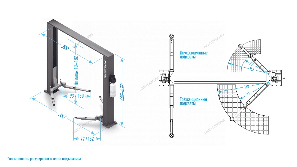 Подъемник двухстоечный 4,5 т, верхняя синхронизация, с электростопорами, 380 В NORDBERG N4124HE-4,5G