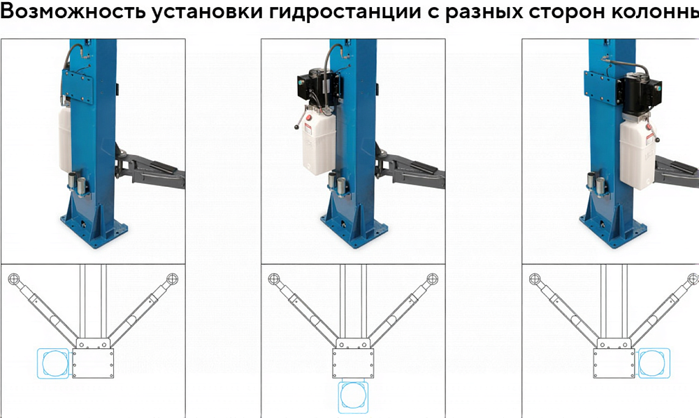 Конструкция двухстоечного подъемника APO-40C_380 позволяет установить гидростанцию на боковой или передней поверхности колонны.