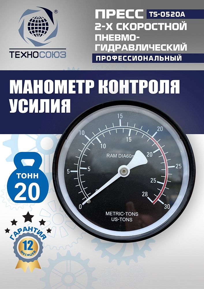 Пресс TS-0520A с усилием 20 тонн сочетает пневмогидравлический и ручной привод для универсальной работы в гаражах и СТО. Пневмопривод ускоряет выпрессовку неответственных деталей вроде втулок при потоке задач, а ручной насос обеспечивает точное дозирование усилия для подшипников.