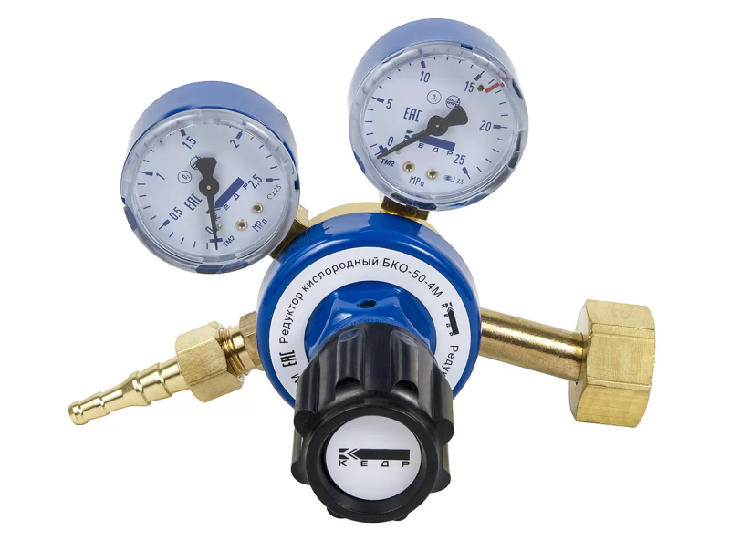 Редуктор кислородный КЕДР БКО-50-4М предназначен для понижения давления газа, поступающего из баллона, и автоматического поддержания заданного рабочего давления постоянным при газопламенной обработке.