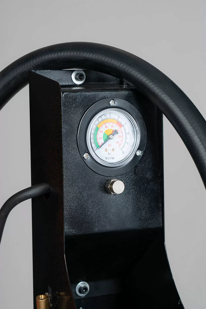 Манометр контроля давления воздуха смонтирован на монтажной стойке. Накачка - нажатием ногой на педаль.