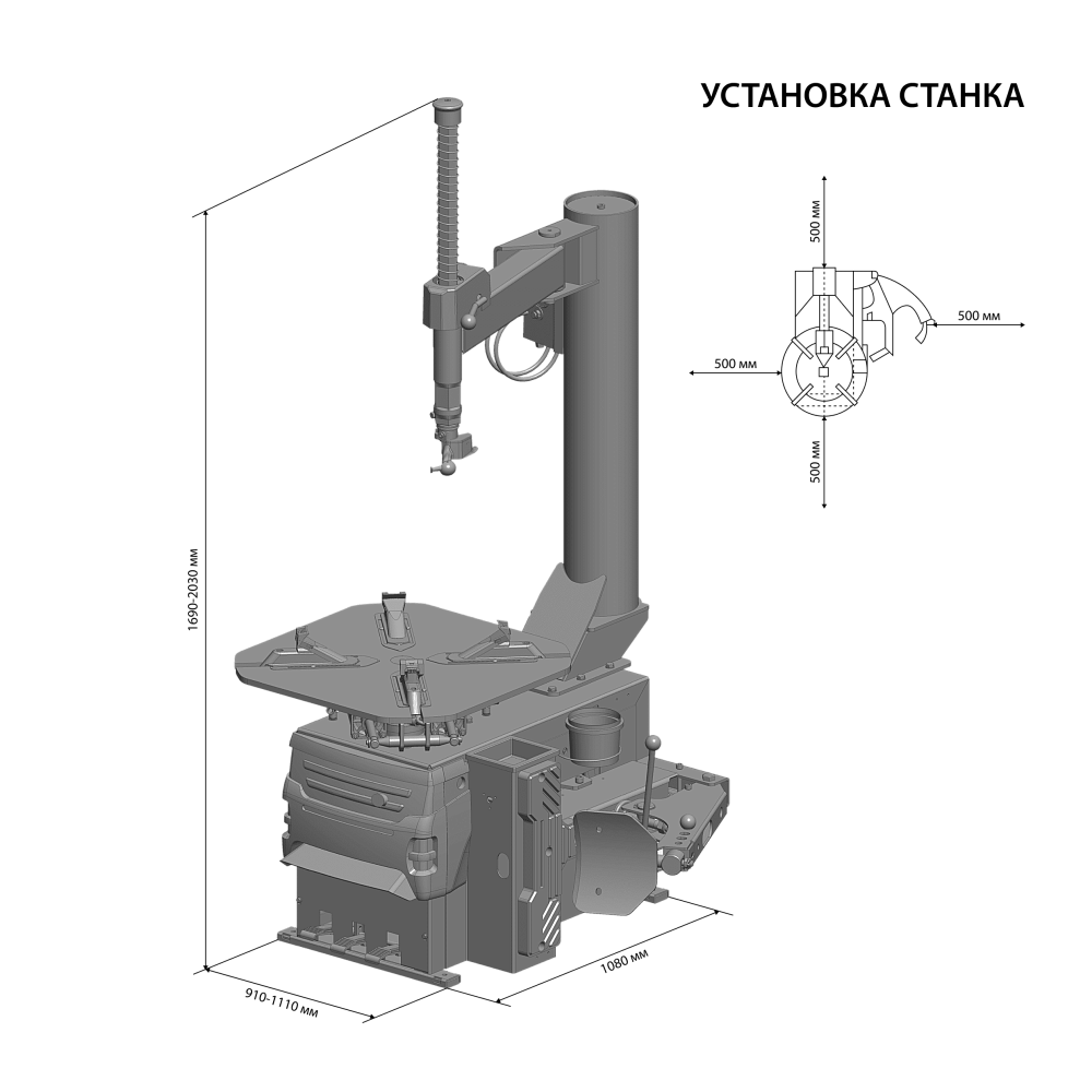 Автоматический шиномонтажный стенд для колес с дисками диаметром 10-24’’. Предназначен для станции технического обслуживания со средним объемом работ. Автомат представляет собой шиномонтажный станок с колонной, которая оснащена пневматическим механизмом фиксации положения монтажной головки в горизонтальном положении и пневматическим же механизмом отвода монтажной стойки.