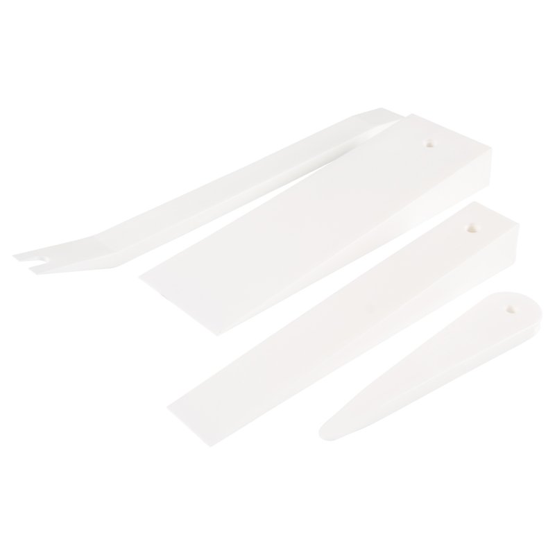 Инструменты изготовлены из полиамида, устойчивого к маслам и растворителям, а форма съёмников позволяет проводить работы без опасения повредить приборную панель или внутреннюю обшивку авто.