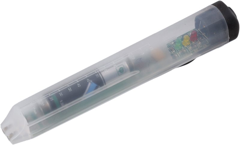 KA-3489BF тестер тормозной жидкости Этот тестер используется в качестве цифрового тестера тормозной жидкости, подходящего для определения качества тормозной жидкости. Разработан для профессионального использования в автомобильных ремонтных мастерских и в обслуживании. Руководство по эксплуатации Нажмите переключатель, чтобы включить - зеленый светодиод загорится, показывая, что батарея в порядке (если загорится красный светодиод замените батарею). Примечание. Тестер имеет функцию автоотключения Погрузите зонд тестера в тормозную жидкость (наконечник зонда должен быть как минимум на 10 мм выше дна резервуара для жидкости). Зеленый светодиод = тормозная жидкость H2O
