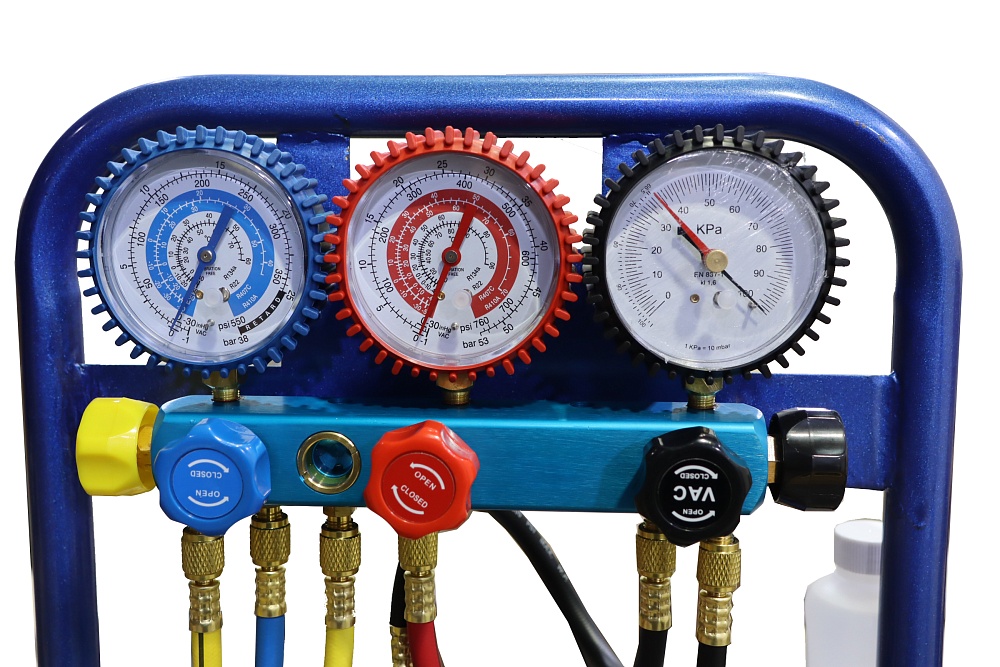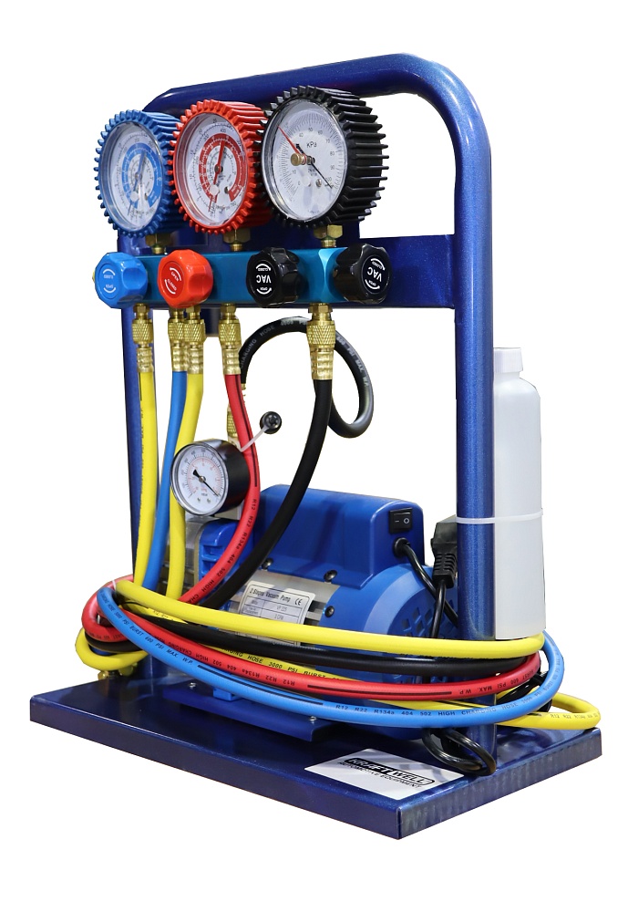 Бюджетный вариант установки для заправки автомобильных систем кондиционирования фреоном R134a. Возможно использование для заправки кондиционеров легковых и грузовых автомобилей, а также сельскохозяйственной техники. Установка представляет собой вакуумный насос "Value" от известного производителя, установленный на металлической раме, к которому подключен 5-вентильный коллектор с тремя манометрами, два из которых измеряют давление в системе кондиционрования (магистраль низкого и высокого давления), а третий измеряет значение вакуума и соединительные шланги длиной 1,5 метра, изготовленные из высококачественных материалов. Установка комплектуется заправочной ёмкостью для заправки масла и, при необходимости, UV красителя в систему кондиционирования, быстросъемными разъемами для подключения шлангов к автомобилю, а также высокоточными электронными весами.